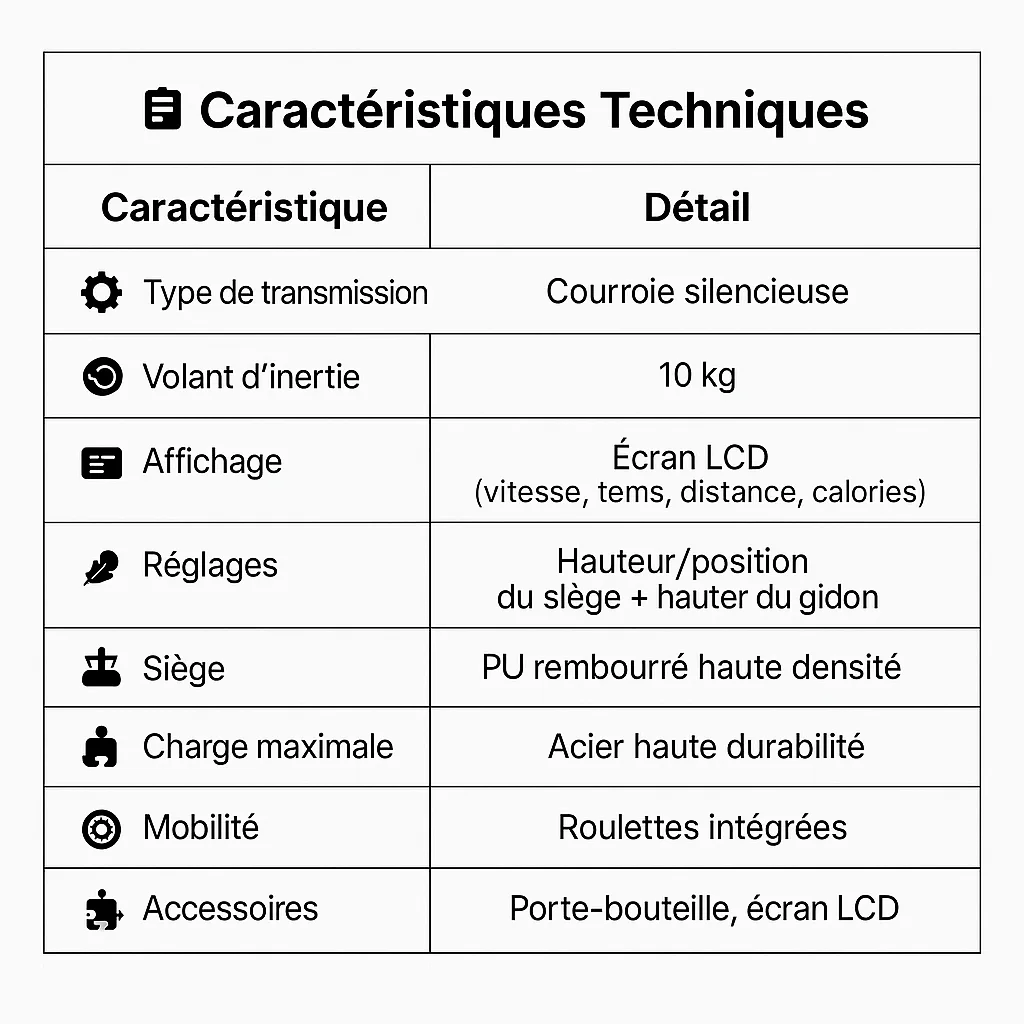 Que vous soyez un athlète confirmé ou un amateur de cardio-training à domicile, ce vélo vous garantit une expérience d’entraînement immersive, fluide et sécurisée.